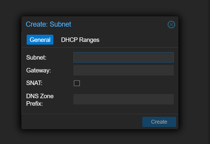 Задаем адрес нашей подсети. Я люблю нечетные числа, поэтому задам адрес 11.11.11.0/24 (но это неправильно с точки зрения использования в production среде). Адрес шлюза 11.11.11.1 нам нужно поставить галку в разделе snat. Это позволит всем устройствам подсети иметь единый внешний айпи адрес, чтобы они имели выход во внешний мир. Днс не трогаем.