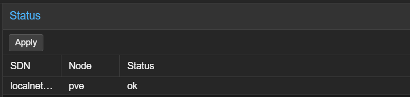 Мы с вами создали зону, vnet, subnet. Теперь чтобы изменения были применены идем в меню SDN и жмем apply. Теперь когда вы перейдете в список сетей вашей ноды, вы увидите что рядом с localnetwork появилась вновь созданная сеть. Все, мы с вами сделали первые шаги, чтобы создать основу для нашей маленькой SDN.